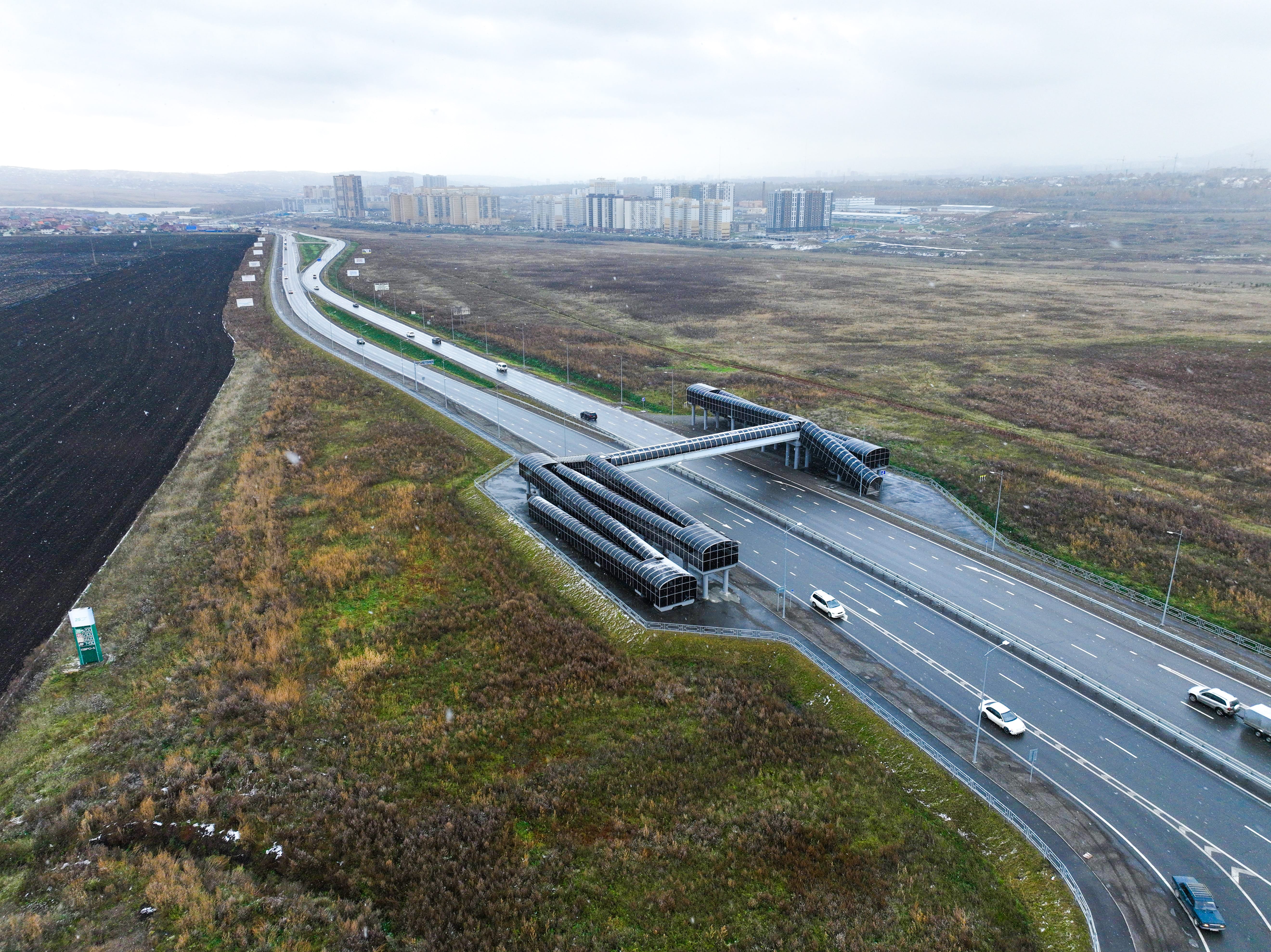Также вблизи перекрестка с трассой Минино – Бугачево подрядчик возвел надземный пешеходный переход, а на 4-ом км дороги устроил автоматический пункт весогабаритного контроля, чтобы исключить движение грузовых машин с превышением нагрузок и сохранить нормативное состояние направления.